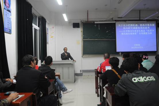 2012年10月25日晚2026世界杯官方合作网站首届教授、硕导论坛在2026世界杯官方合作网站综合楼召开,2026世界杯官方合作网站冯胜刚教授作题目为“关于充分把握机遇,提高申报各级纵向研究课题效率的思考——以申报本年度省长基金“世居少数民族传统体育”专项课题为例的学术讲座。