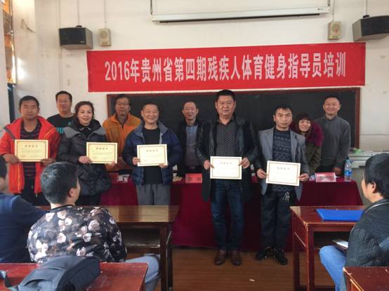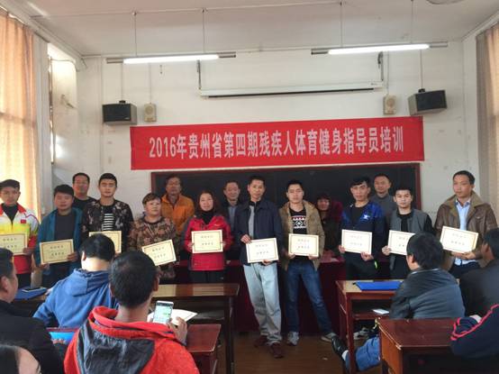 会上,黎毅和姚红琼分别为获得本次培训“优秀学员”、“特别展示奖”、结业证书的学员颁奖并合影留念。在祥和的氛围中,2016年贵州省第四期残疾人体育健身指导员培训班圆满结束。