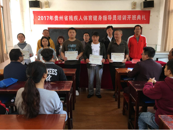 接着,蒙黎明、曾晓进和姚红琼分别为获得本次培训“优秀学员”、“特别展示奖”、结业证书的学员颁奖并合影留念。在祥和的氛围中,2017年贵州省第四期残疾人体育健身指导员培训班圆满结束。