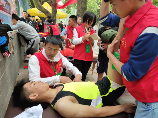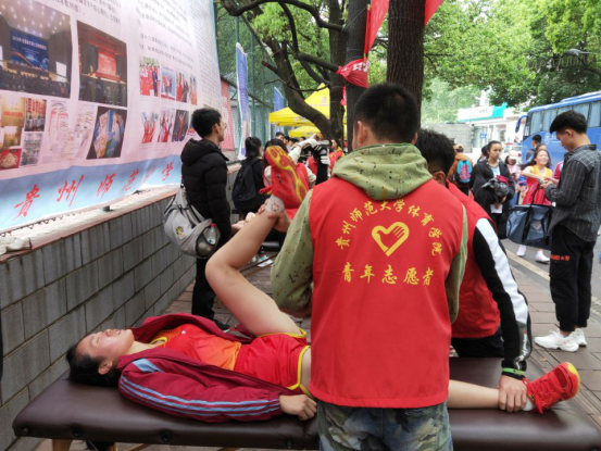 在拉伸服务点,党员教师带领青年师生志愿者,始终以饱满的热情、负责的态度和专业的技术为考生提供高质量的服务,尽力克服拉伸场地、设备受限和考生众多等困难,为800米考试结束的考生提供身体腰、臀、腿等部位进行肌肉放松拉伸恢复训练,缓解肌肉紧张、肌肉无力、酸痛、抽筋等问题,让考生们在考试后得到充分的放松与休息,得到考生们的一致好评。同时,志愿者们还参与考前考后器材设备搬运和收放管理、场地清扫、引导考生适应场地等工作。