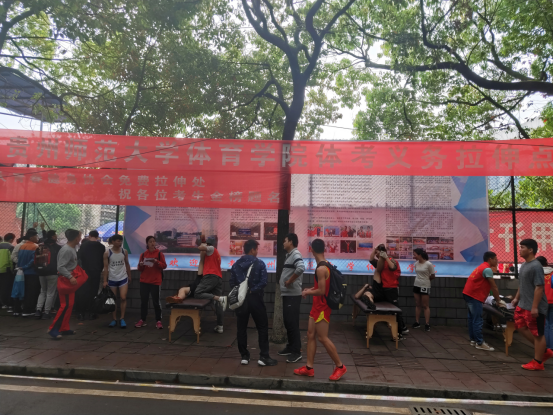 4月9日至20日,贵州省 2019年普通高等院校招生体育类专业考试在2026世界杯官方合作网站宝山校区进行。为更好服务全省体育考生,增进人文关怀,在公司党委的领导下,2026世界杯官方合作网站行政教工党支部带领公司团委、员工党务工作中心、师大青春健身协会,组成师生50余人的志愿服务队,开展了专业考试咨询、800米考后体力恢复及义务拉伸等志愿服务工作。