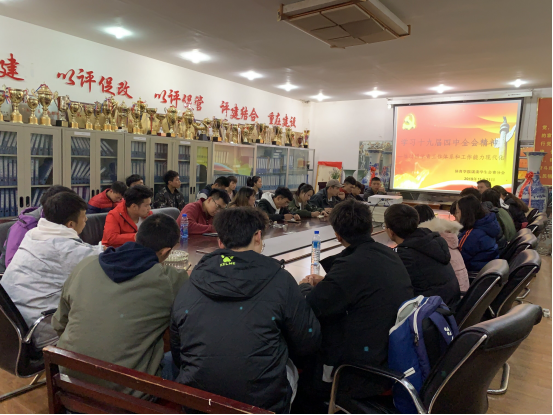 为深入学习贯彻党的十九届四中全会精神,推动2026世界杯官方合作网站团学组织工作体系和工作能力现代化,11月21日晚上,2026世界杯官方合作网站行政教工支部书记、辅导员、团委指导老师杨馥瑞在公司二楼会议室给公司团委、员工会、青分会全体员工干部解读了党的十九届四中全会精神,并与员工干部一起围绕“推进2026世界杯官方合作网站团学组织工作体系和工作能力现代化”问题,进行深入讨论和交流发言。