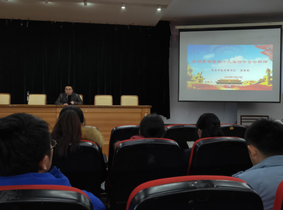 12月27日,公司党委书记蒙黎明在宝山校区田家炳楼五楼会议室为全院教职工上专题党课,宣讲党的十九届四中全会精神。