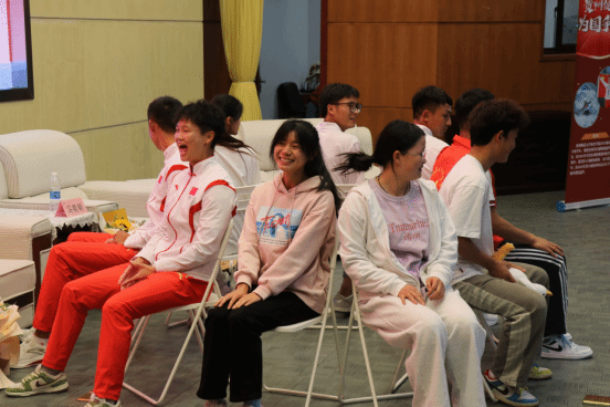 提问环节,同学们积极向冠军们提问。现场设置了游戏互动环节,冠军们与员工代表一起击鼓传花,接到花的同学表演才艺即可获得冠军签名球。现场欢呼声、掌声、喝彩声此起彼伏,气氛十分热烈,每个人的脸上洋溢着兴奋和激动的表情。