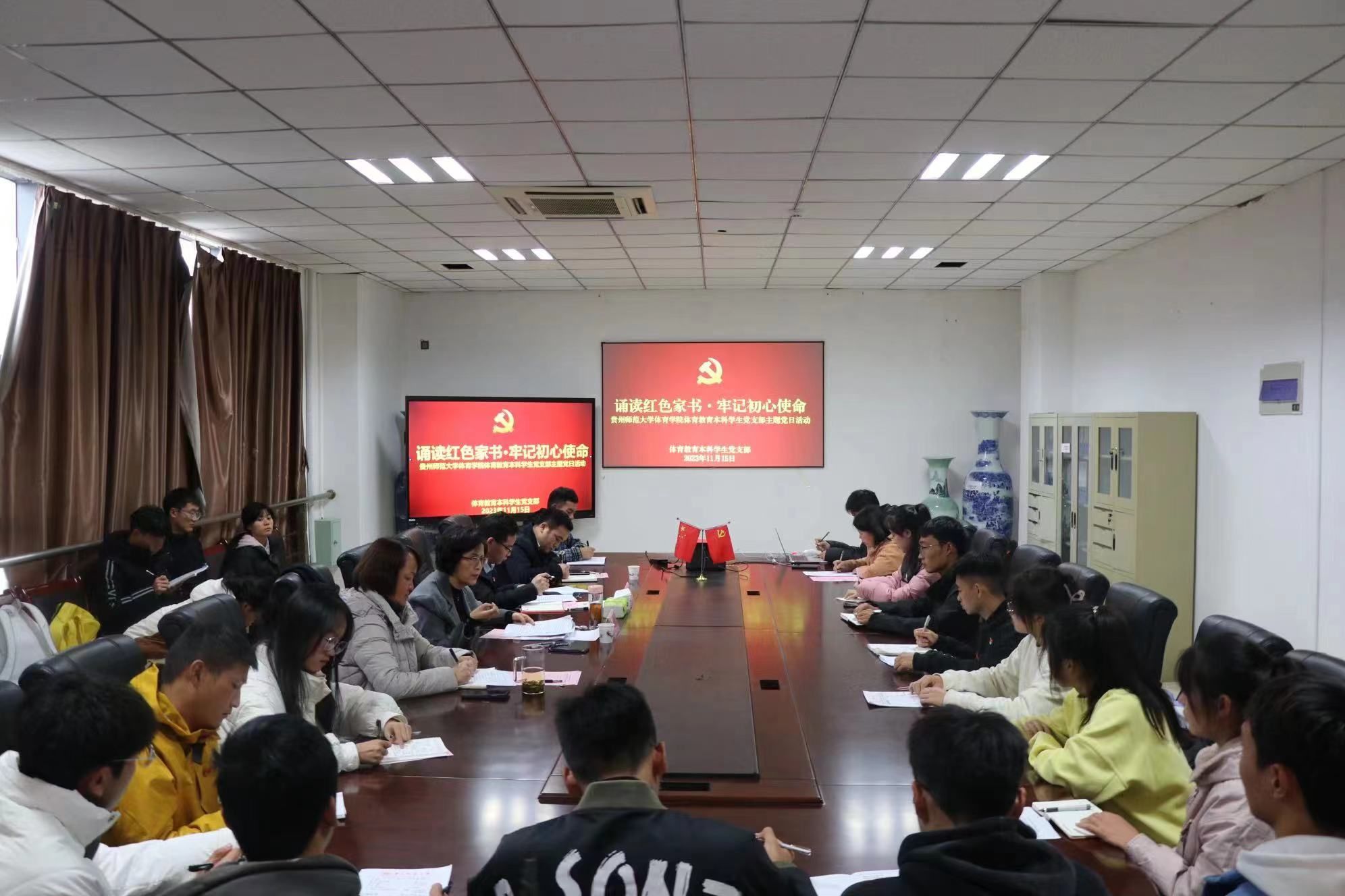 11月15日,2026世界杯官方合作网站体育教育本科员工党支部在合一楼三楼会议室开展“诵读红色家书·牢记初心使命”主题党日活动。公司党委副书记银熙惠出席并指导本次活动,公司党委组织部副部长吴展城、公司党委书记吕涛、党委副书记张怀德及体育教育本科员工党支部党员、发展对象和入党积极分子代表参加。会议由支部书记张雪雷主持。