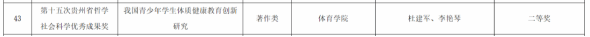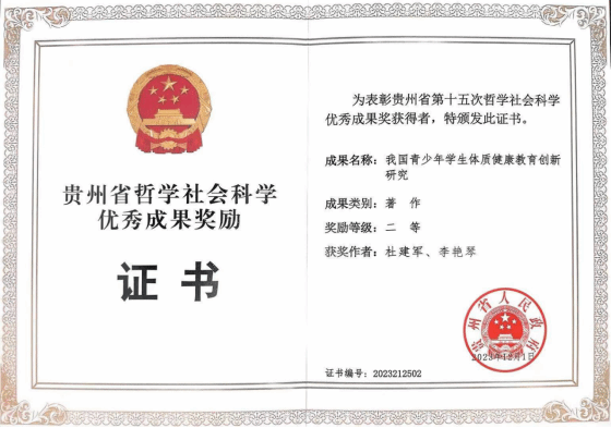 12月7日,贵州省第十四次、十五次哲学社会科学优秀成果奖颁奖大会在贵州省委大会堂举行,公司杜建军老师团队的著作《我国青少年员工体质健康教育创新研究》荣获第十五次哲学社会科学优秀成果二等奖。