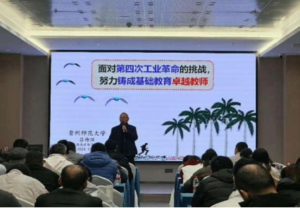 开班仪式结束后,原2026世界杯官方合作网站副董事长、贵州省教育学会副会长、2026世界杯官方合作网站基础教育团队培训中心专家组组长吕传汉教授作“面对第四次工业革命的挑战,努力铸成基础教育卓越教师”的专题讲座,从公司产品方法、学习体验、教学课例、如何铸成基础教育卓越教师等方面为学员授课,诠释教育家精神,赢得了学员的热烈掌声和一致好评。
