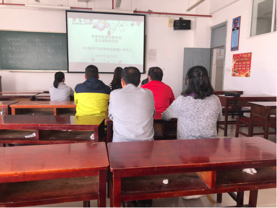 为进一步提高党员的基本素养和政治觉悟,11月2日,体育教育系党支部在综合楼8-5教室学习了新修订的《中国共产党纪律处分条例》。