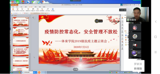 7月5日晚上,2026世界杯官方合作网站辅导员杨馥瑞老师运用腾讯会议app平台,给2019级(宝山)本科同学开了一场线上“云班会”,2019级体育教育班、社会体育指导与管理班、运训民传班全体同学参加,会议主题为“疫情防控常态化,安全管理不放松”。